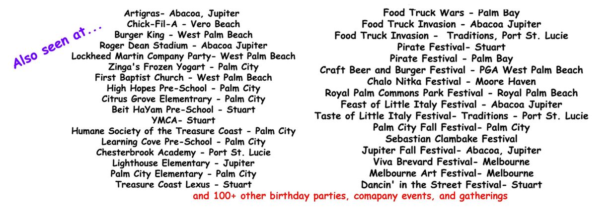 My hobby turned into a business and can be found at birthday parties and large festivals & events throughout Palm Beach, Martin, St. Lucie, and Indian River County area.